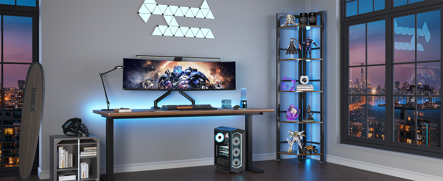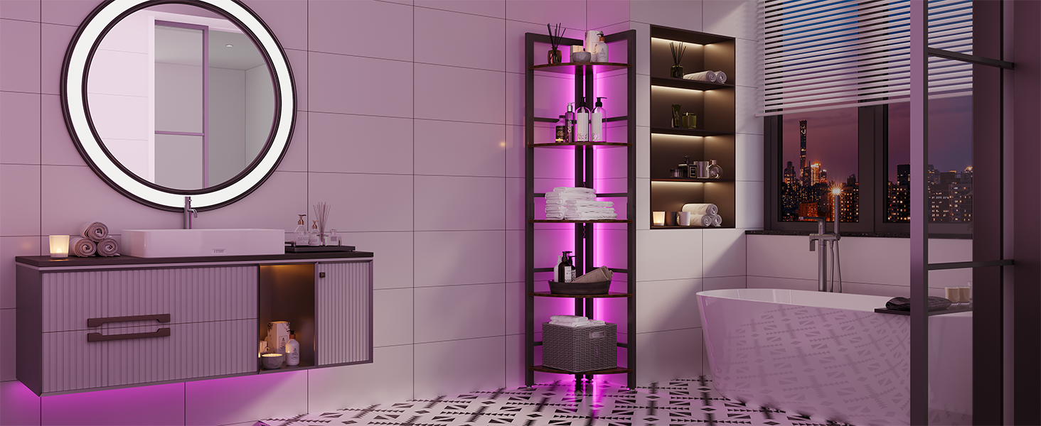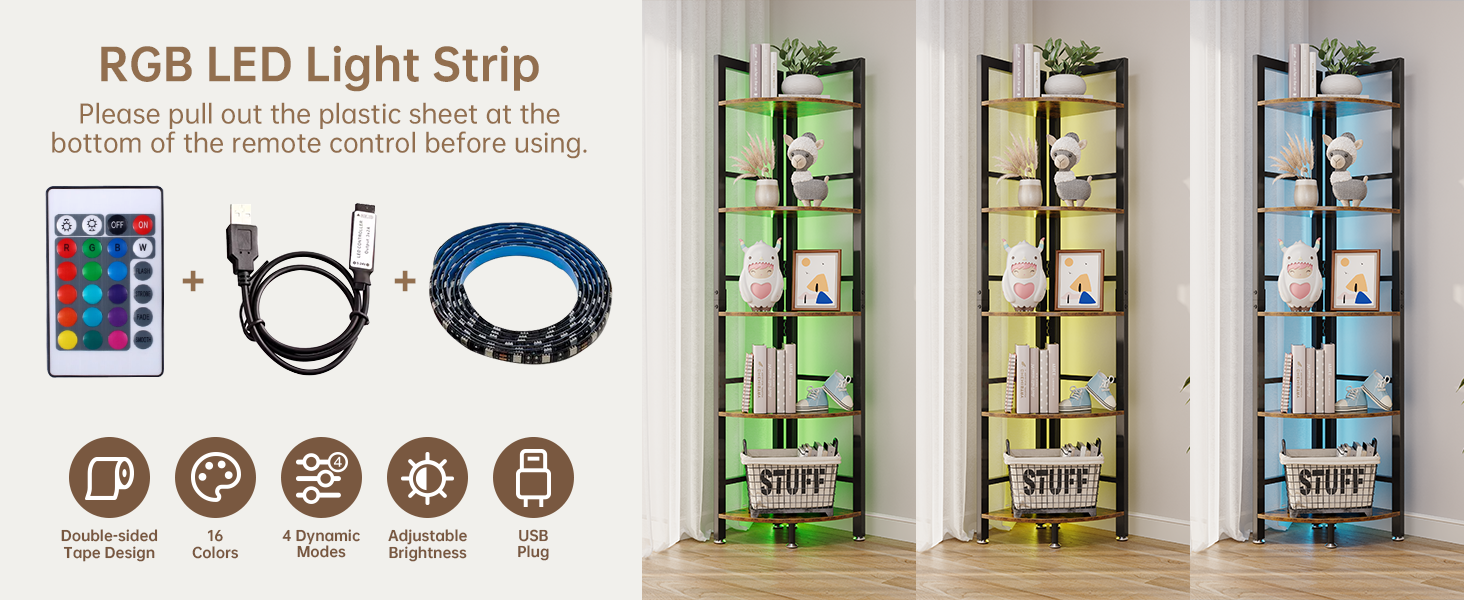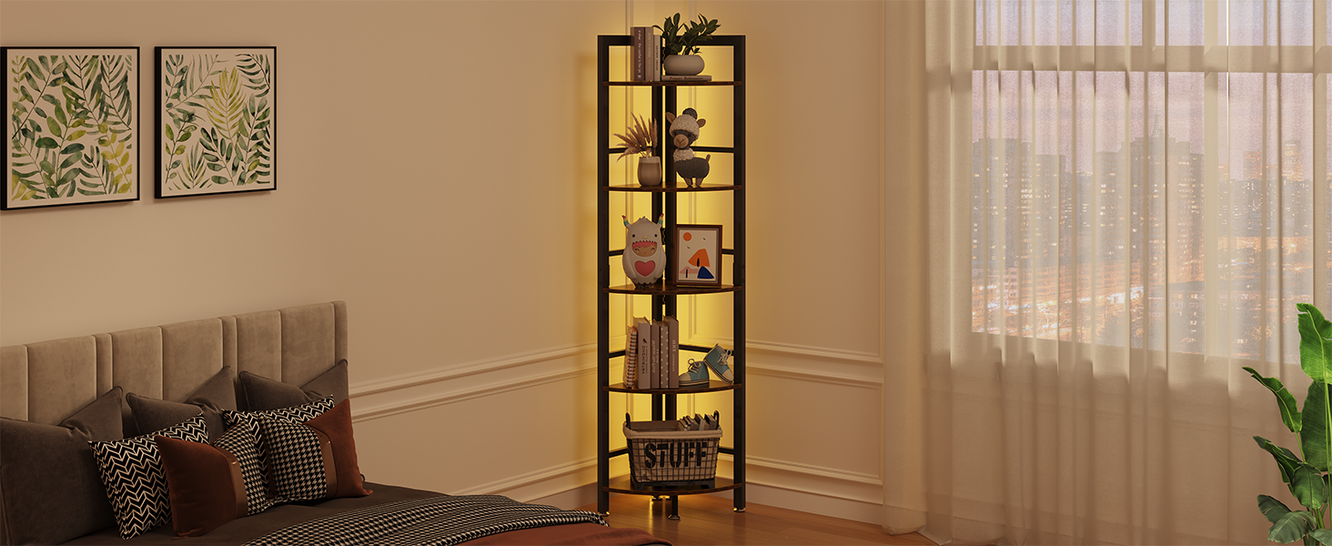 - 【LED Light】 OtterOasis corner shelf features a detachable LED light strip that enhances the atmosphere of your space. It is ideal for displaying decorative items like figurines, ornaments, photos. With 16 color options and 4 dynamic lighting modes, this versatile corner bookcase is suitable for various rooms such as the living room, bedroom, kitchen, bathroom, and balcony. You can effortlessly adjust the lighting to complement your room decor or to suit your mood