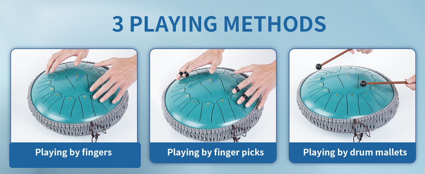 - Note: For beginners, we recommend that you play with the drumsticks we provide. Playing the steel tongue drums requires strong finger strength.