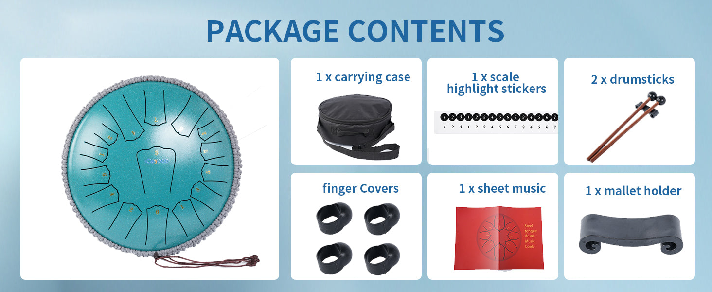 - Package Included:The steel drum comes with 1 x carrying case, 8 x scale highlight stickers, 2 x drumsticks, 1 x sheet music, 1 x mallet holder,1 x instruction manual.