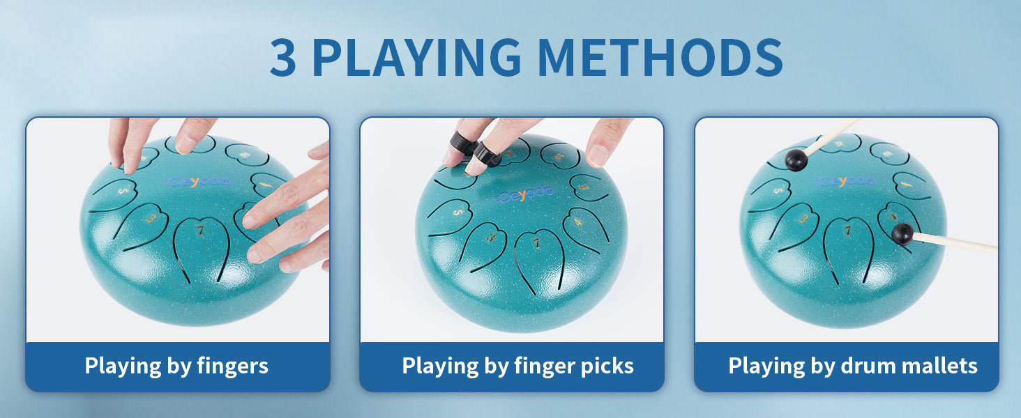 - Note: For beginners, we recommend that you play with the drumsticks we provide. Playing the steel tongue drums requires strong finger strength.