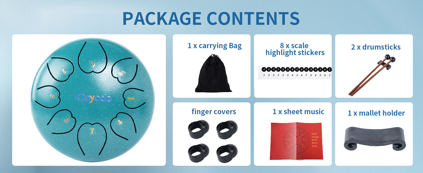 - Package Included:The steel drum comes with 1 x carrying bag, 8 x scale highlight stickers, 2 x drumsticks, 1 x sheet music, 1 x mallet holder,1 x instruction manual.