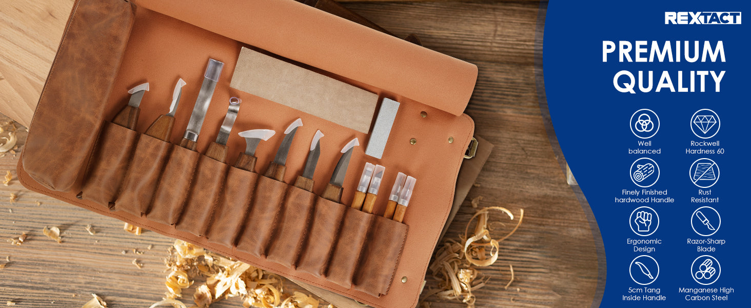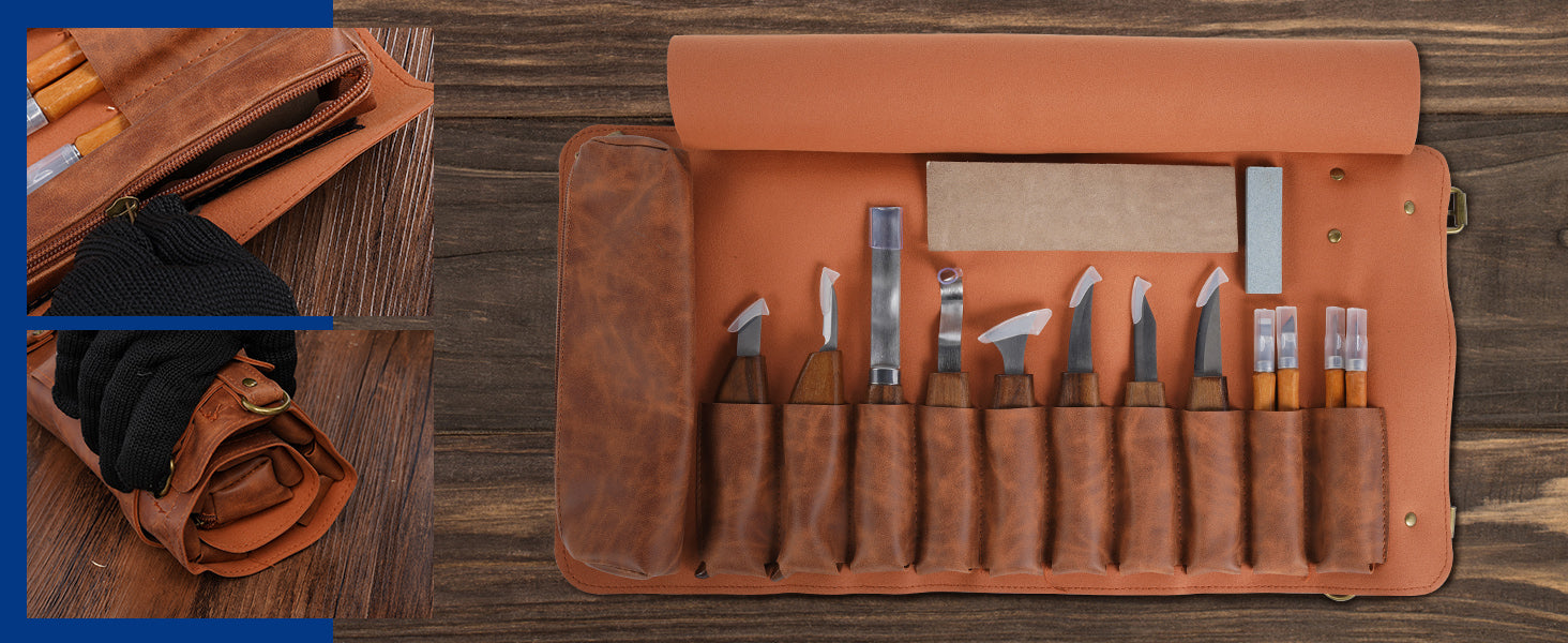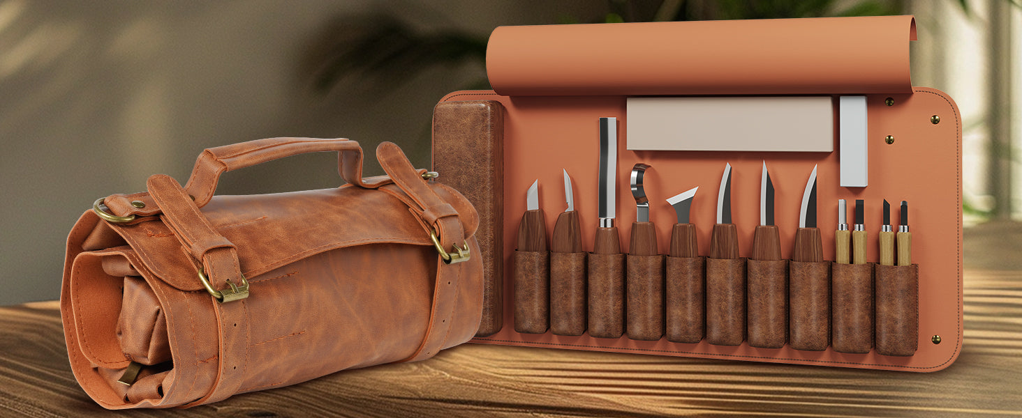 - 【Elegant Leather Roll with Blade Sheaths】 Keep your wood carving set organized in a sleek leather roll with custom-fitted sheaths for each wood carving knife. This wood carving kit ensures your tools are safely stored and easy to access, whether you're carving wood at home or outdoors, making sure your wood carving knives are always protected and ready for use.