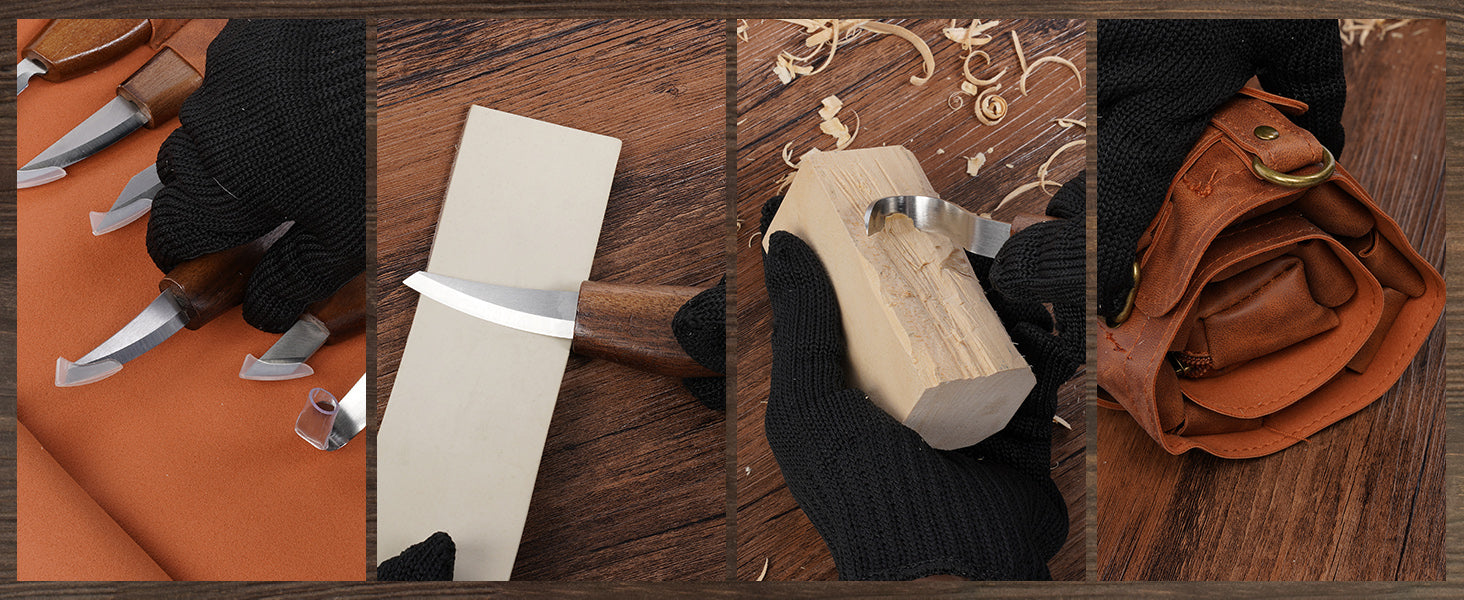 - 【16-Piece Wood Carving Kit】 This wood carving kit includes 8 wood carving knives, 4 detail carving tools, gloves, polishing compound, sharpening strop, and a leather roll. Ideal for beginners and experts, this whittling kit provides the perfect tools for precise wood carving, from simple projects to intricate designs.
