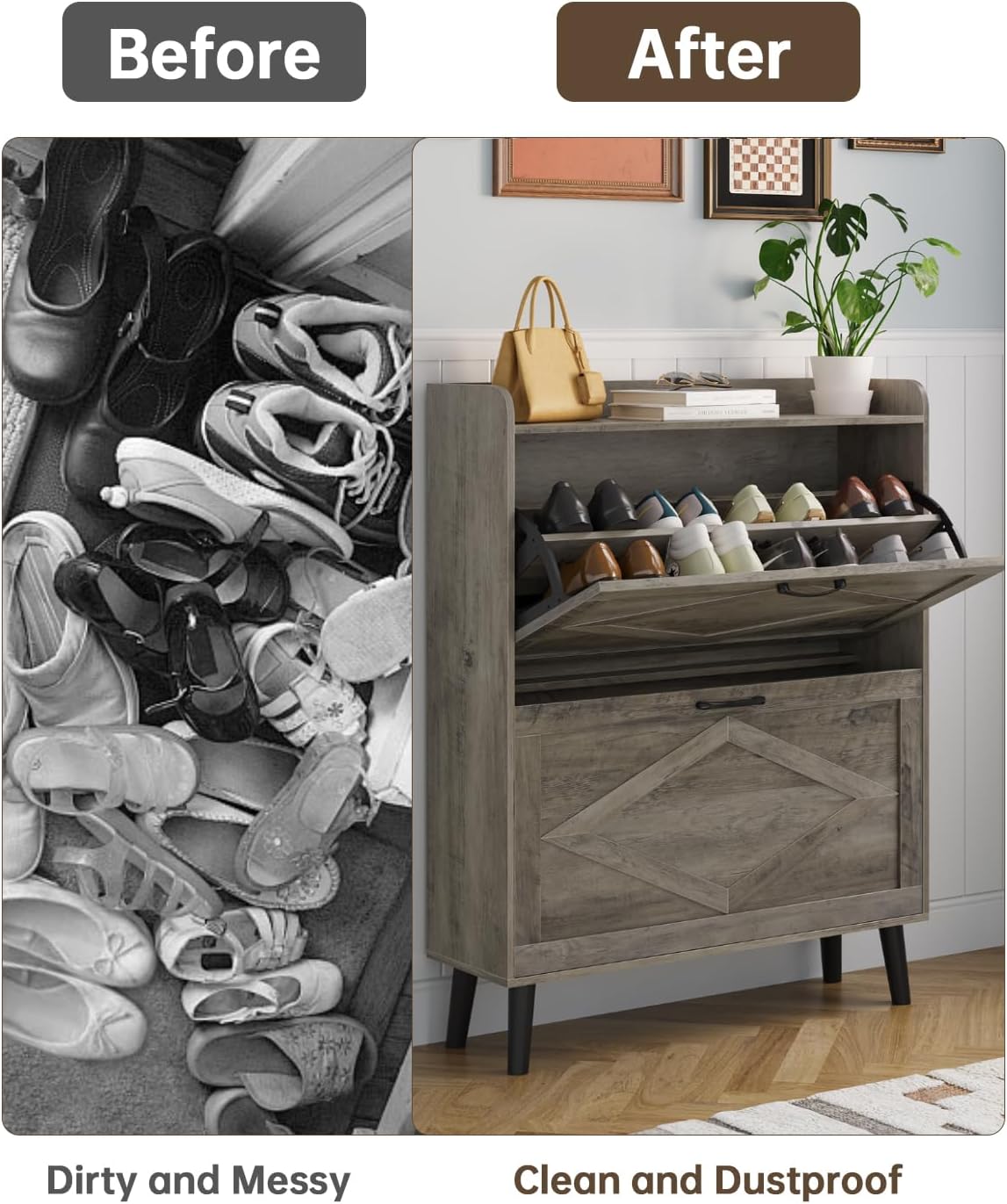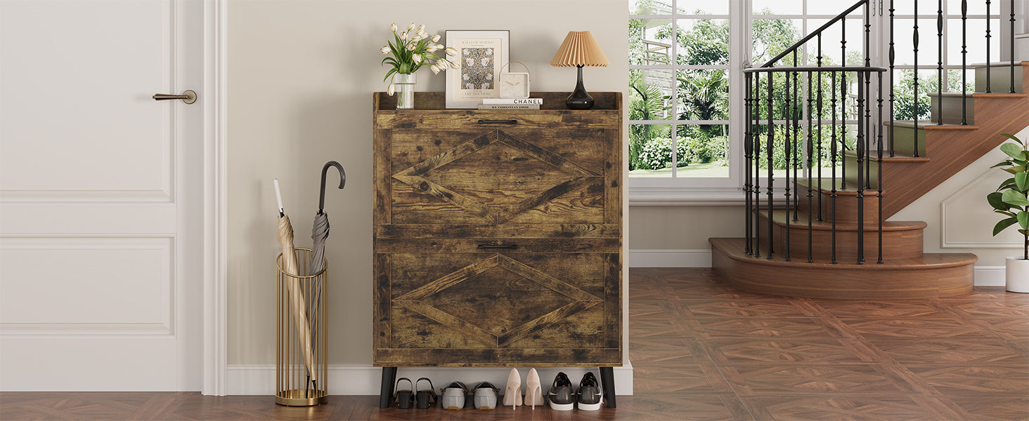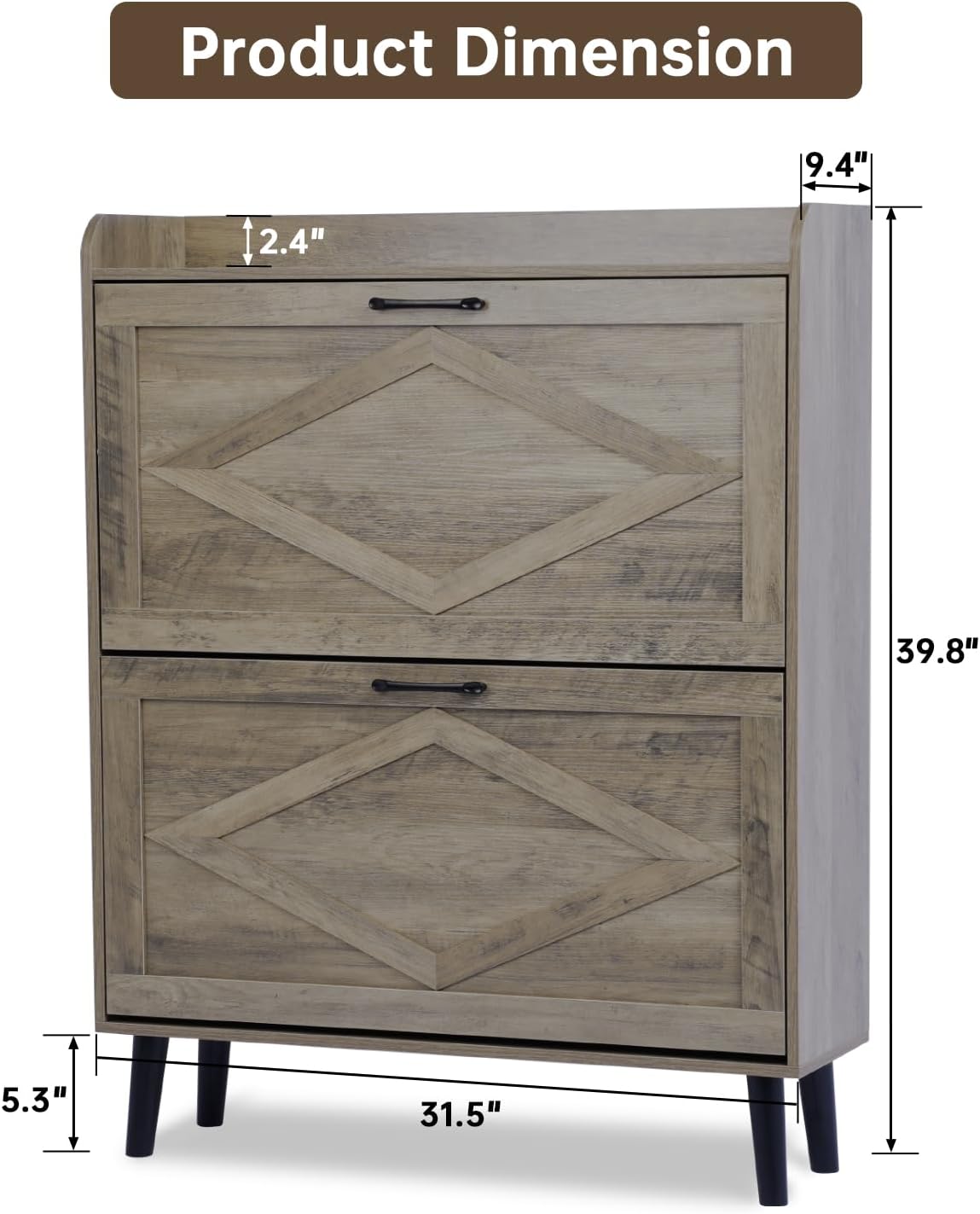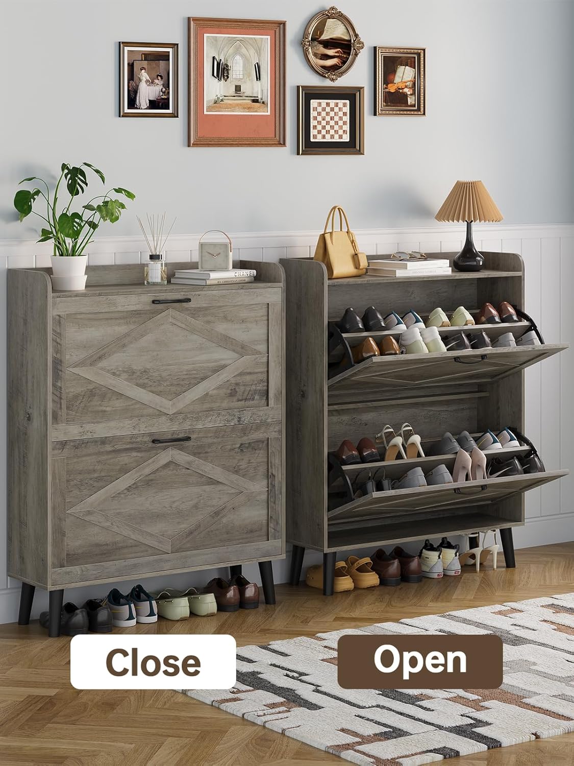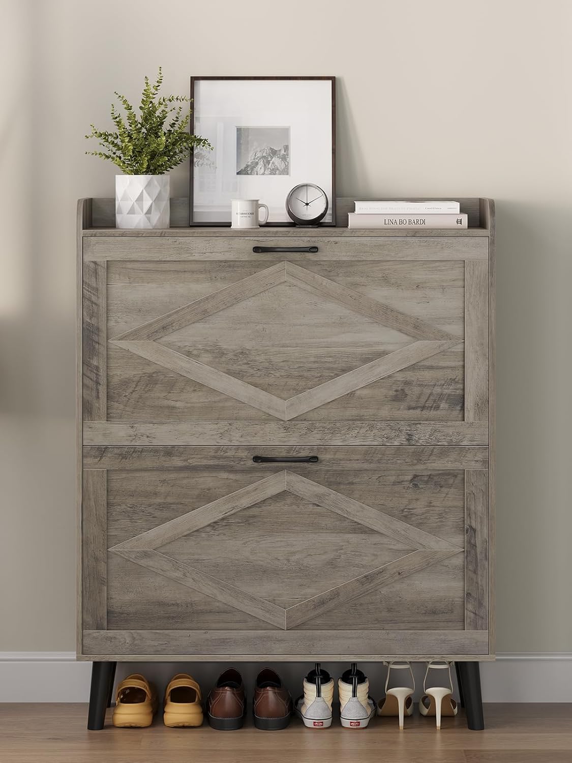 - Farmhouse Shoe Storage Cabinet: The washed gray wood grain and chic rhombic patterns complement this farmhouse shoe storage cabinet; As an entryway shoe cabinet, it blends with various decors and keeps your entryway tidy