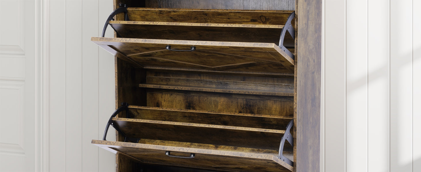 - Flip Drawer Shoe Cabinet: 2 flip drawers of the shoe cabinet can be opened and closed effortlessly for easy access; The 9.4 inches wide hidden narrow shoe storage cabinet fits into your entryway, living room, porch, etc