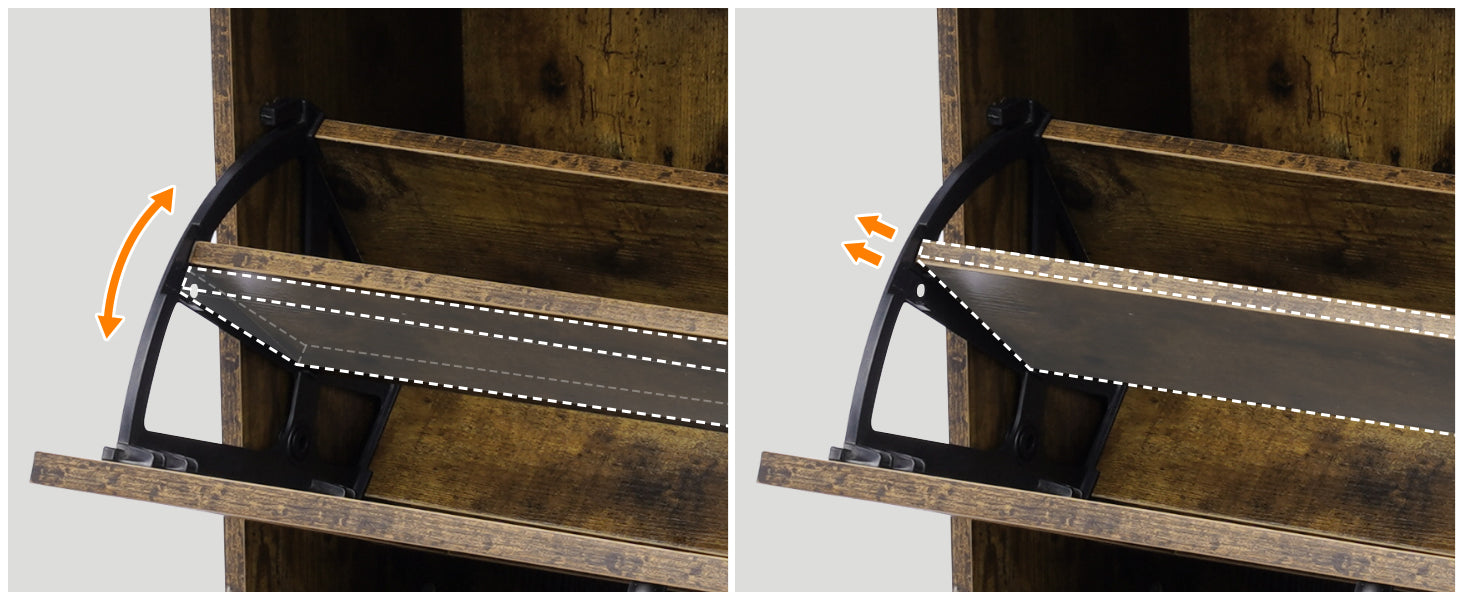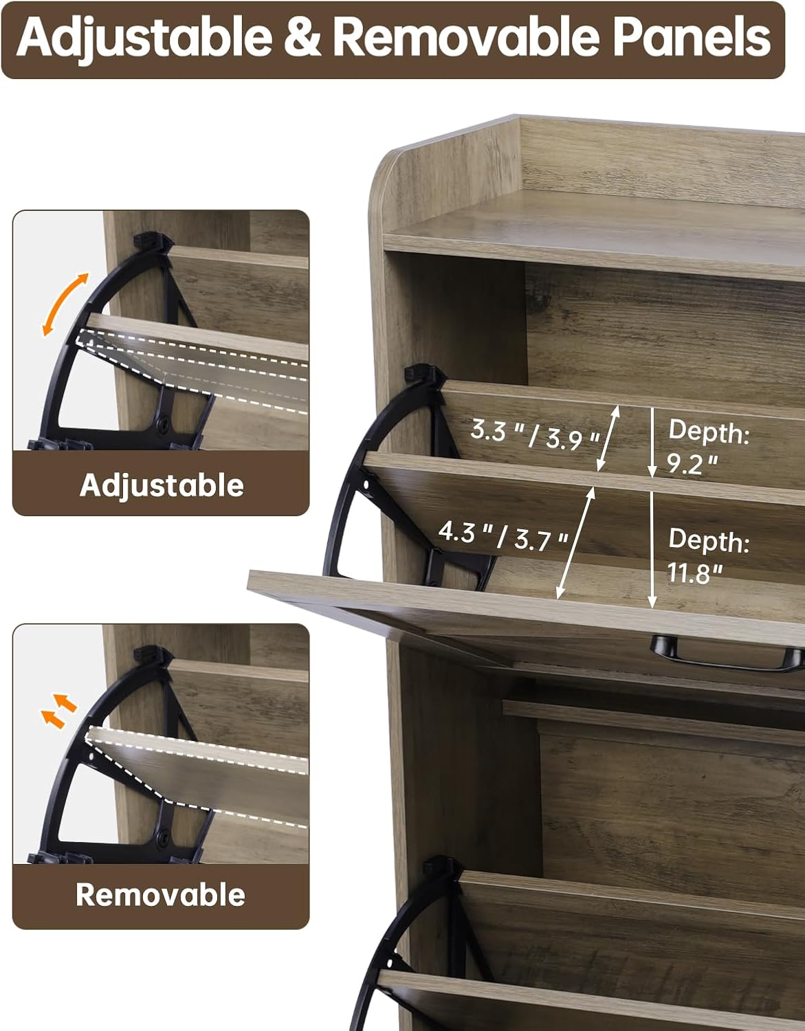 - Large Capacity Shoe Cabinet: The 2 flip drawers with 4 adjustable and removable panels are suitable for storing different shoes; The shoe cabinet top offers spaces for keys, bags, and potted plants, while the bottom area is perfect for your home slippers or a robotic vacuum