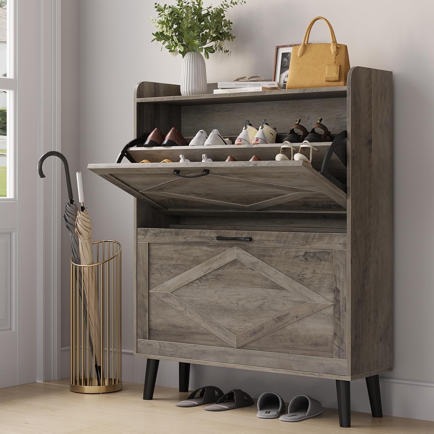 Shoe Storage Cabinet, 2 Flip Drawers, Farmhouse Narrow Shoe Organizer with Wood Legs, Gray