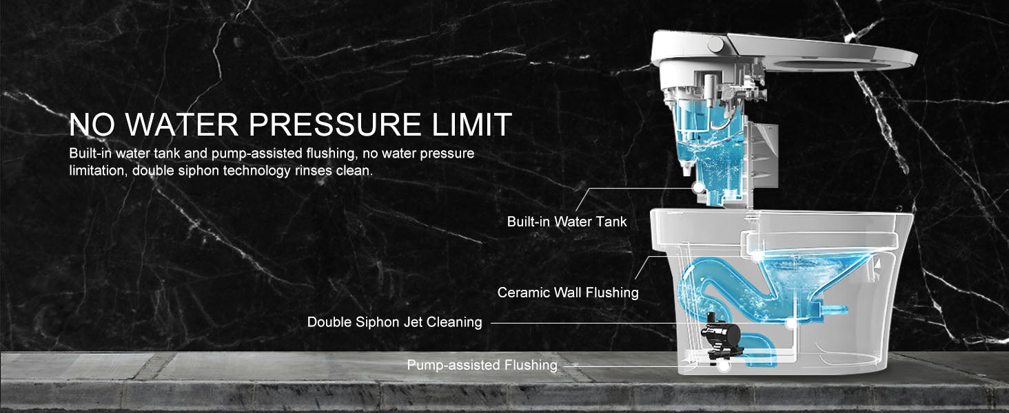 - π‘π’ πͺππ§ππ₯ π£π₯ππ¦π¦π¨π₯π πππ ππ§- This smart toilet with built-in tank and pump-assisted flushing for more stable flushing, realizing true zero water pressure suitable for homes in areas with low water pressure. The smart bidet toilet also features a double cleaning function with siphon jet flushing to ensure thorough and efficient cleaning.