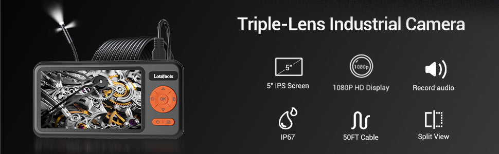 Triple-Lens Borescope, 5" IPS Split View Endoscope Camera, 32GB Card for Plumbing & Auto (50FT)