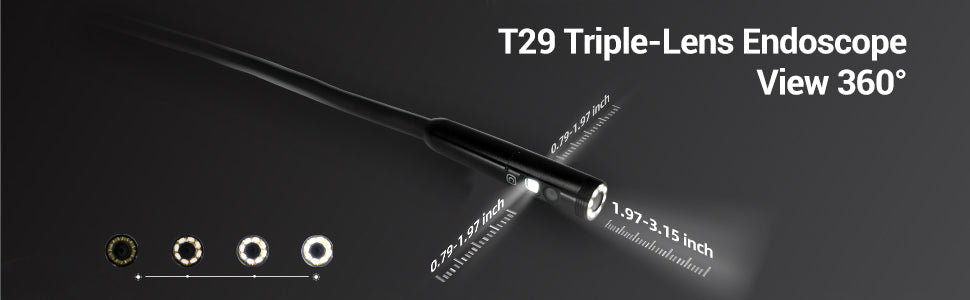 - Durable Industrial Camera: The T29 inspection camera is IP 67 and has 4 adjustable LED lights. The front lens focal range is 1.97-3.15 inch. The side lens is 0.79-1.97 inch.