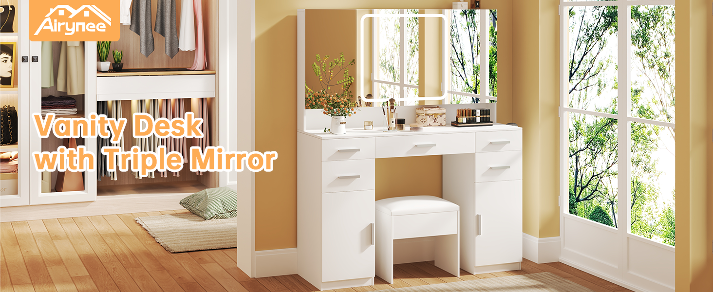 - 【Makeup vanity with triple folding mirror 】The big vanity is equipped with a large triple folding mirror (mirror size: 46 "L * 19.7" W), allowing you to observe yourself from multiple angles while applying makeup or styling. Completing exquisite makeup and outfit with an elegant posture in a short time.