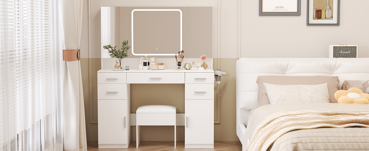 - 【Ample Storage Space】Our glass top vanity has 5 drawers, 2 cabinets, and additional hidden storage space behind the mirror and under the stool, which can store all your beauty products, cosmetics, hairdressing tools, etc. This unique design provides additional space for storing cosmetics, skincare products, and more.